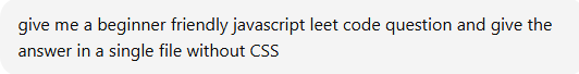 • ask chatgpt for a beginner friendly javascript leed code quesstion and make an html javascript single file answer without any CSS
